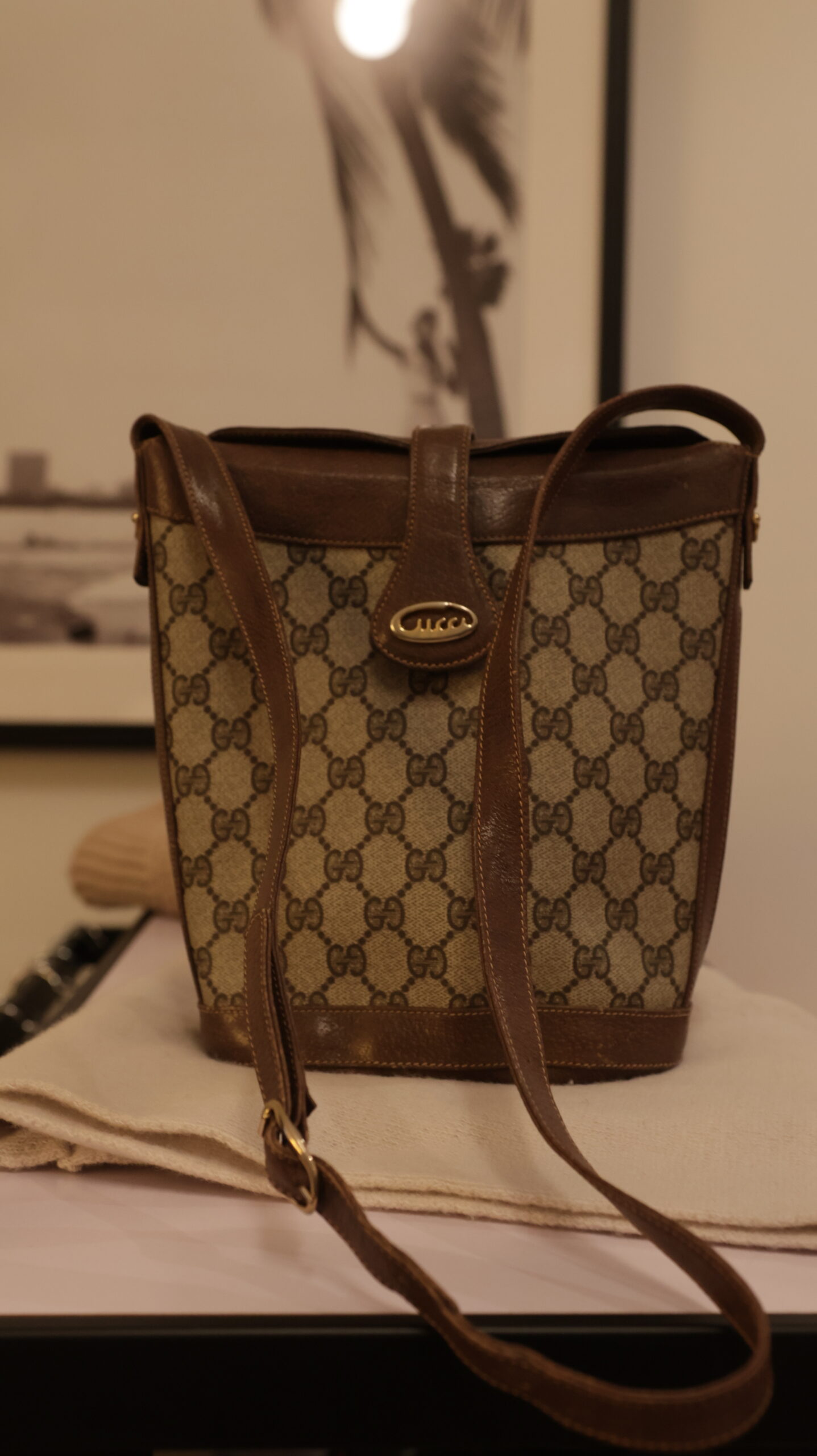 Gucci Vintage Bucket Bag w monogramie GG to klasyk w stylu retro, który wraca w trendach co sezon. Połączenie charakterystycznego monogramu z brązowymi skórzanymi wykończeniami nadaje torebce ponadczasowego wyglądu, a fason bucket/mini tote jest wygodny i bardzo praktyczny na co dzień.