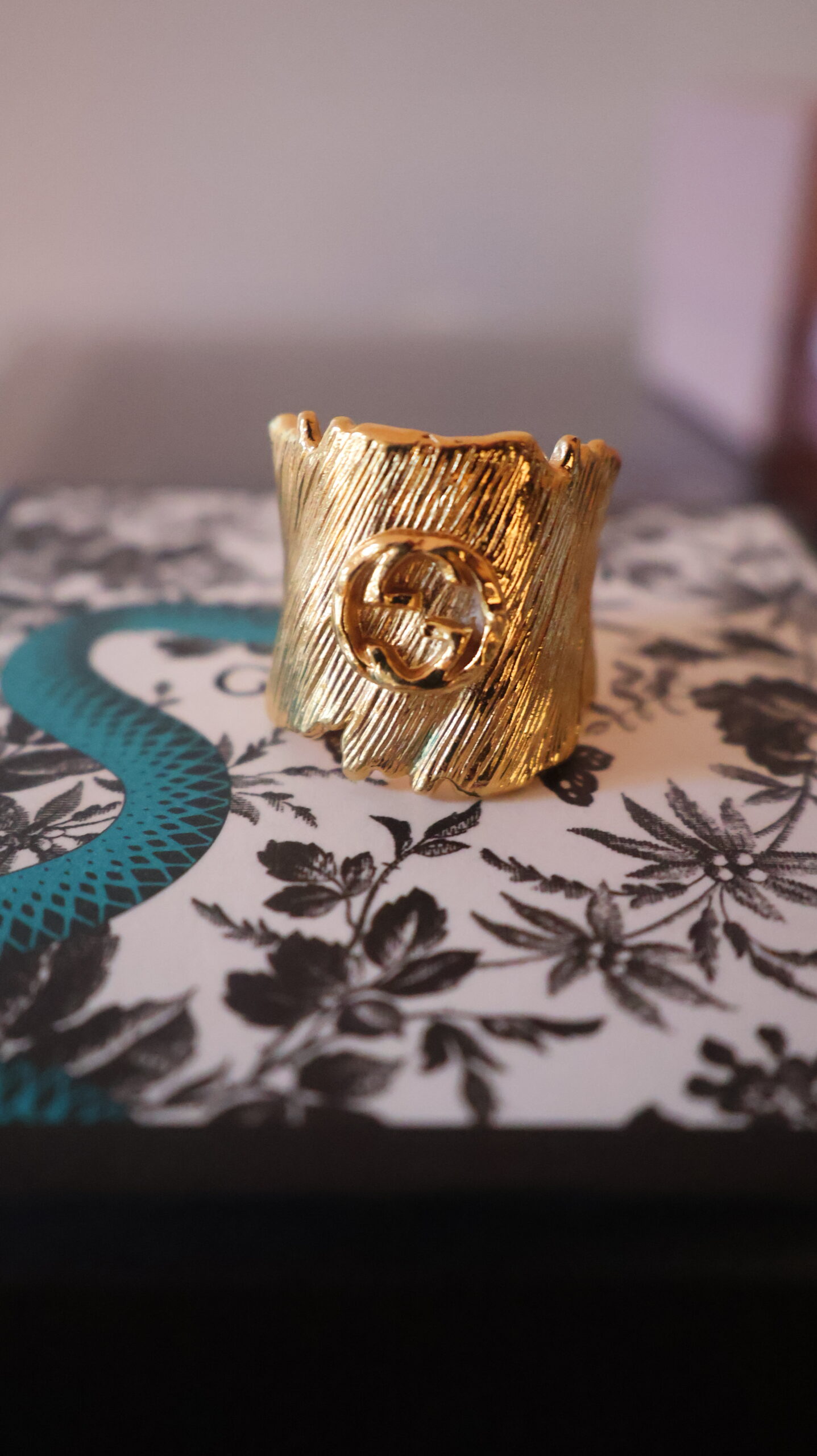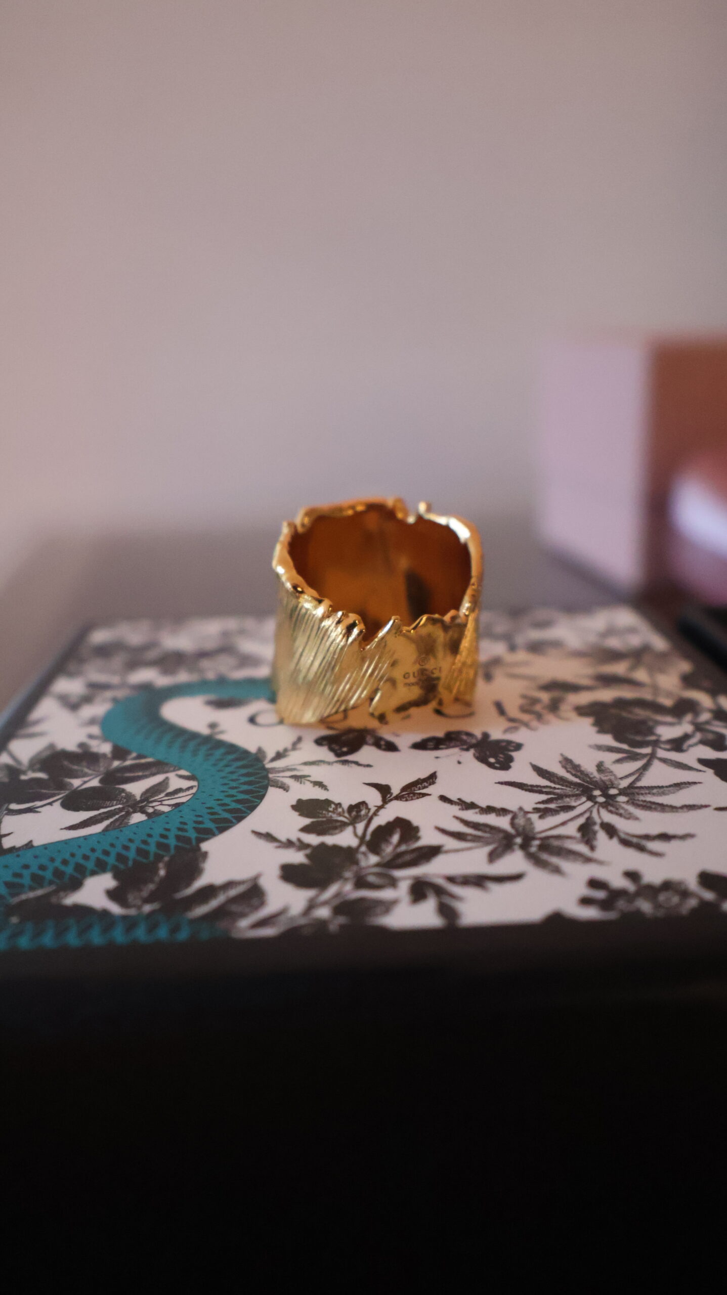 Pierścionek Gucci to wyrazisty i odważny dodatek, który idealnie wpisuje się w eklektyczną, włoską estetykę tego słynnego domu mody. Prezentowany model to masywna, szeroka obrączka w odcieniu złota, która z pewnością przyciągnie spojrzenia i stanie się głównym, biżuteryjnym punktem każdej stylizacji.