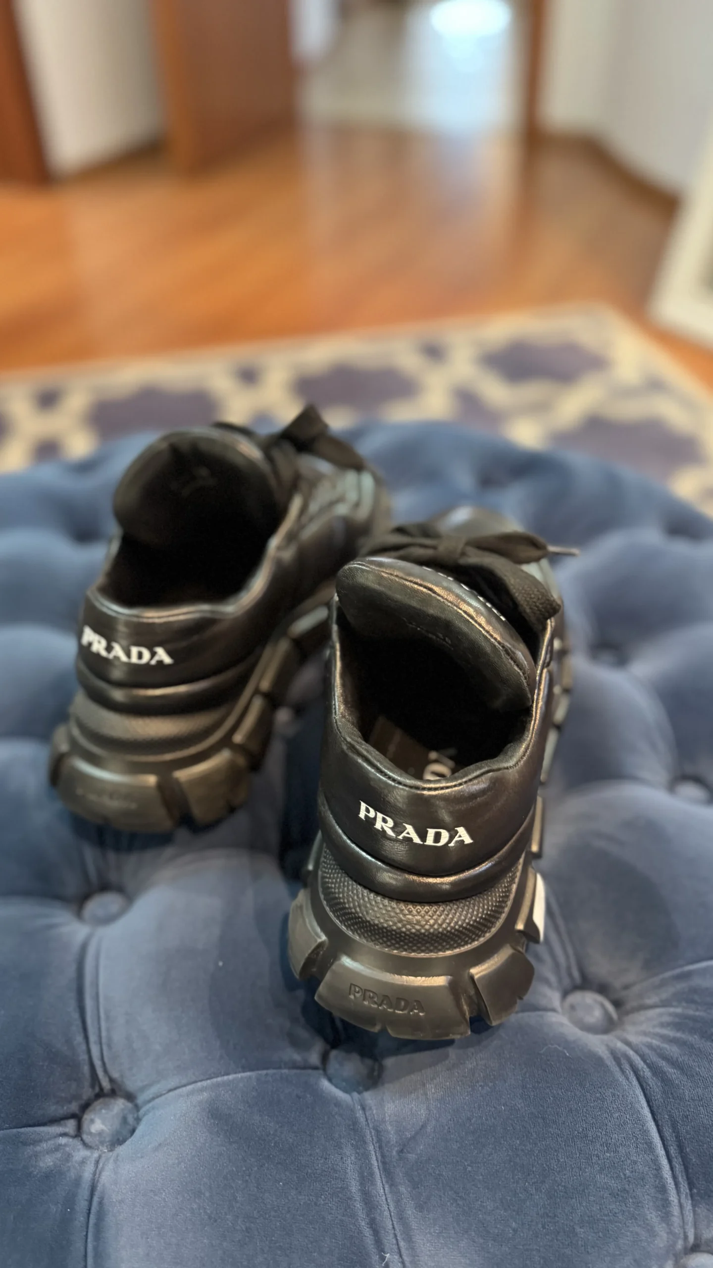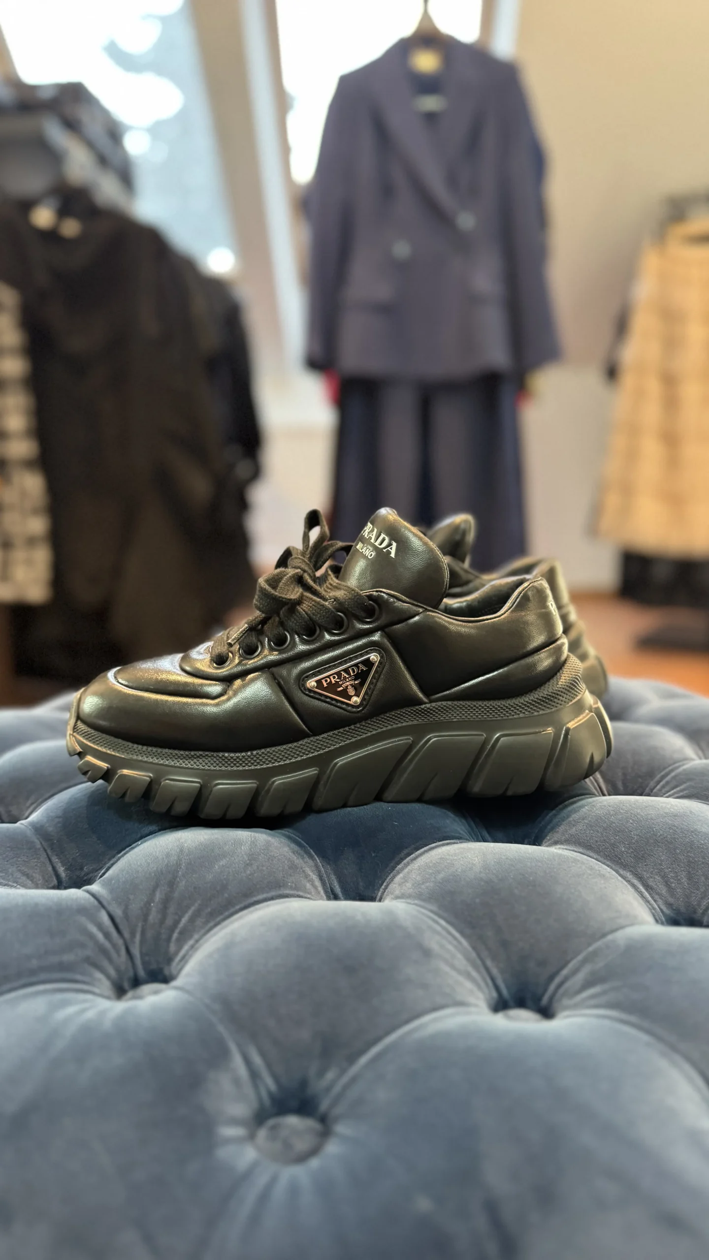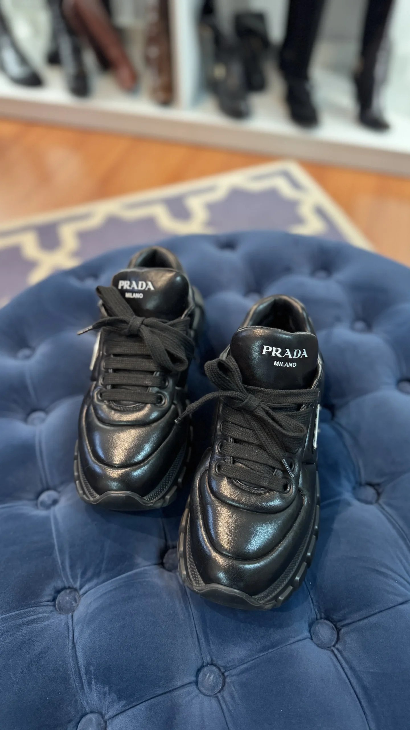 Sneakersy Prada to model, który idealnie wpisuje się w trend chunky shoes, łącząc sportową wygodę z luksusowym wykończeniem. Buty wykonane są z wysokiej jakości, gładkiej skóry w kolorze czarnym, co czyni je niezwykle uniwersalnymi i łatwymi w pielęgnacji.