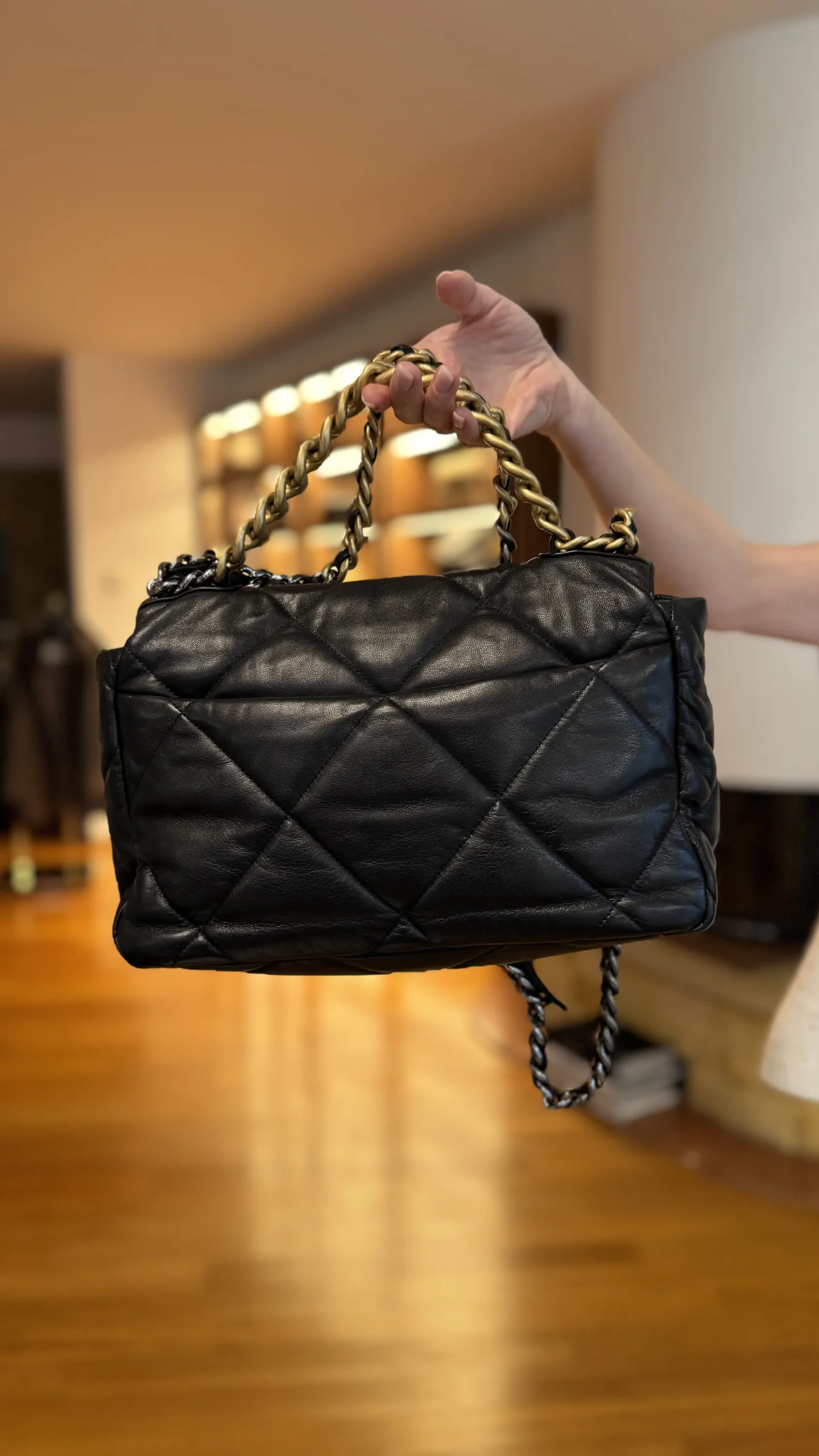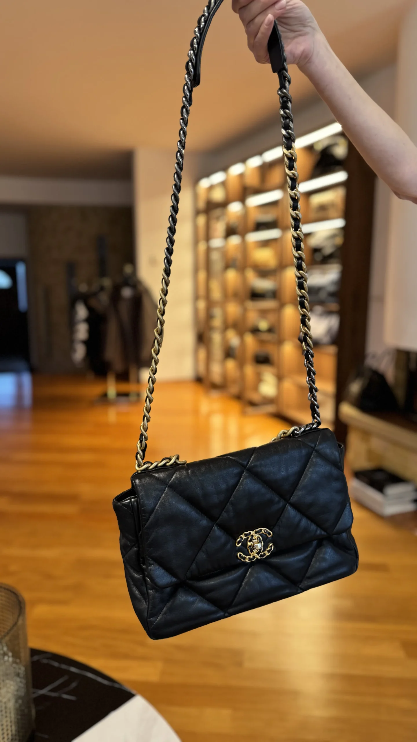 Torebka Chanel 19 to model, który błyskawicznie stał się nowoczesnym klasykiem – nazwany na cześć roku premiery (2019), jest ostatnim wielkim projektem Karla Lagerfelda. Prezentowany egzemplarz wykonany jest z niezwykle miękkiej, plastycznej skóry w kolorze czarnym, która układa się w charakterystyczną, luźniejszą formę niż w modelu Classic Flap.