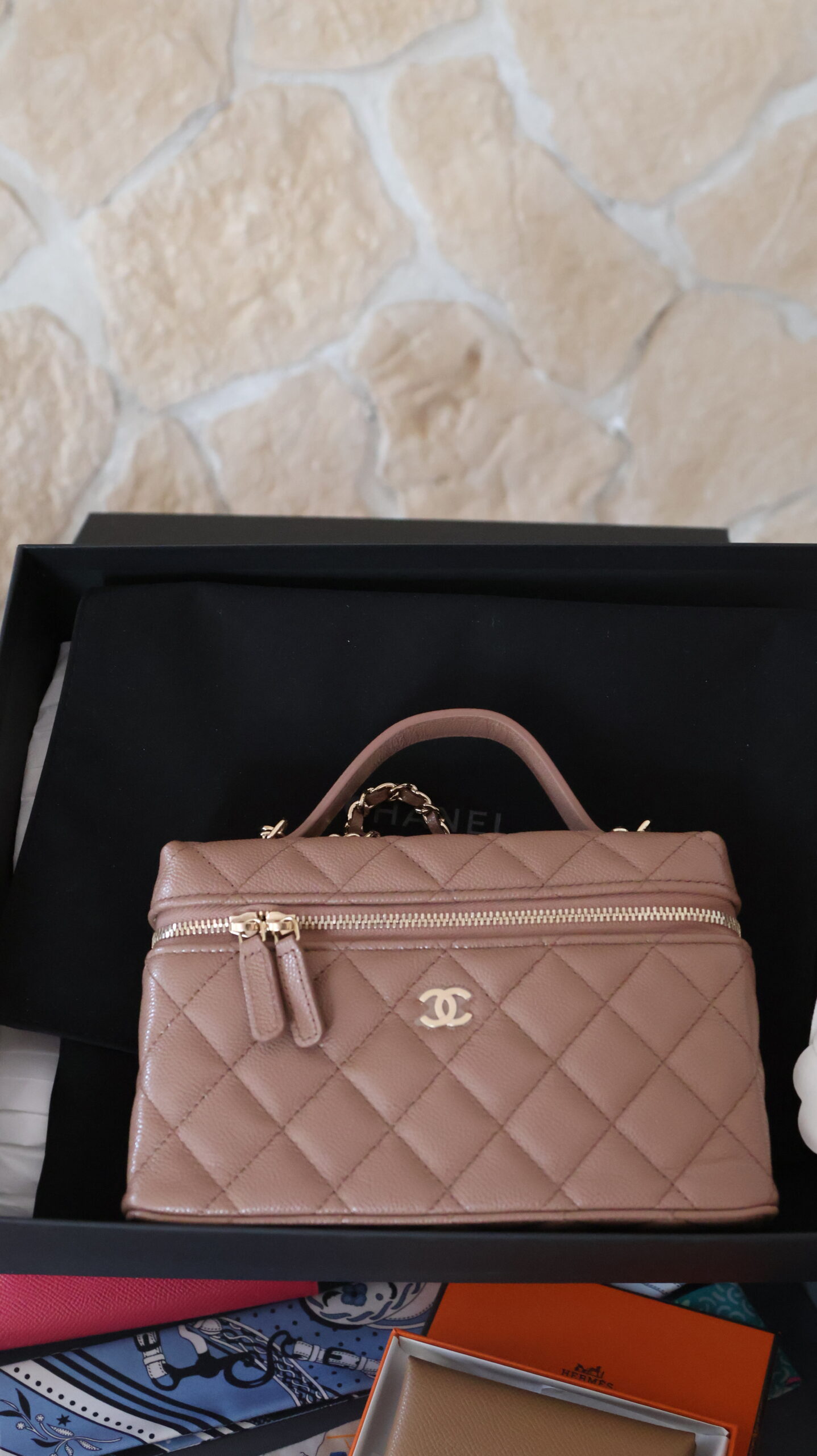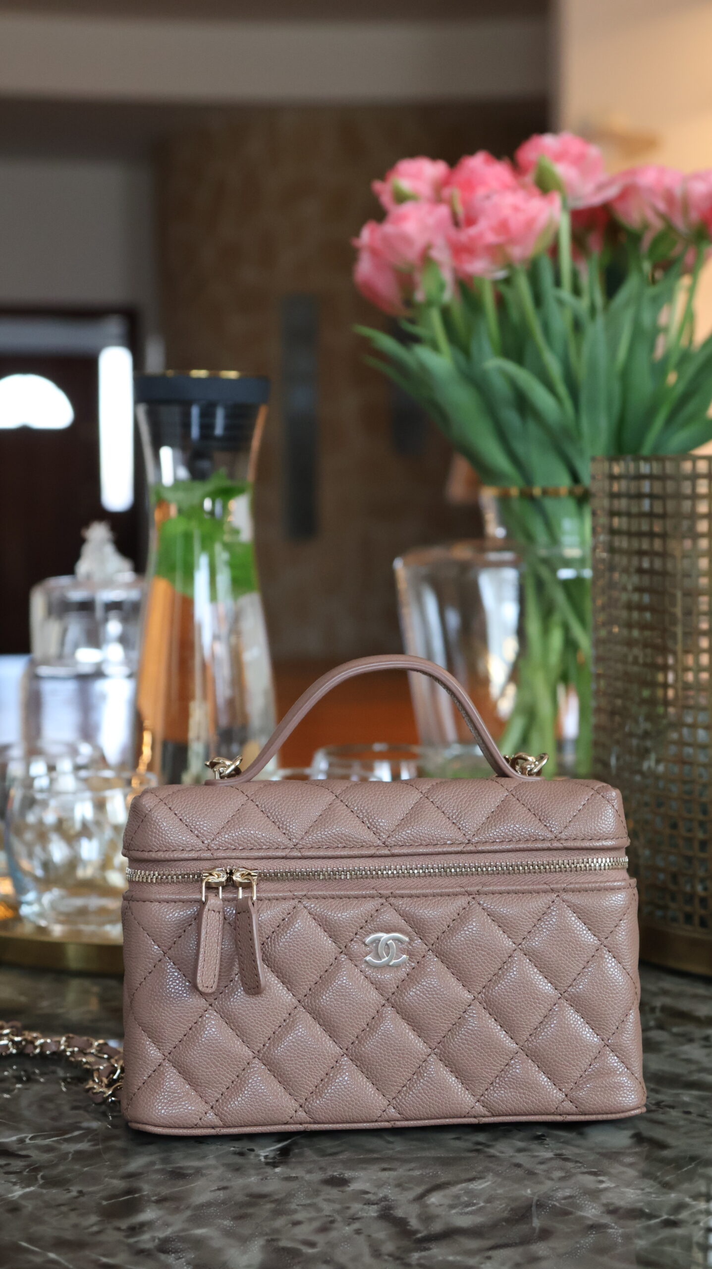 Torebka Chanel Vanity Case (w niezwykle zgrabnej, podłużnej wersji slim) to absolutny hit ostatnich sezonów. Ten model, pierwotnie inspirowany klasycznymi, luksusowymi kuferkami na kosmetyki, został mistrzowsko zreinterpretowany przez dom mody, stając się jednym z najbardziej pożądanych i uroczych akcesoriów w świecie high fashion.