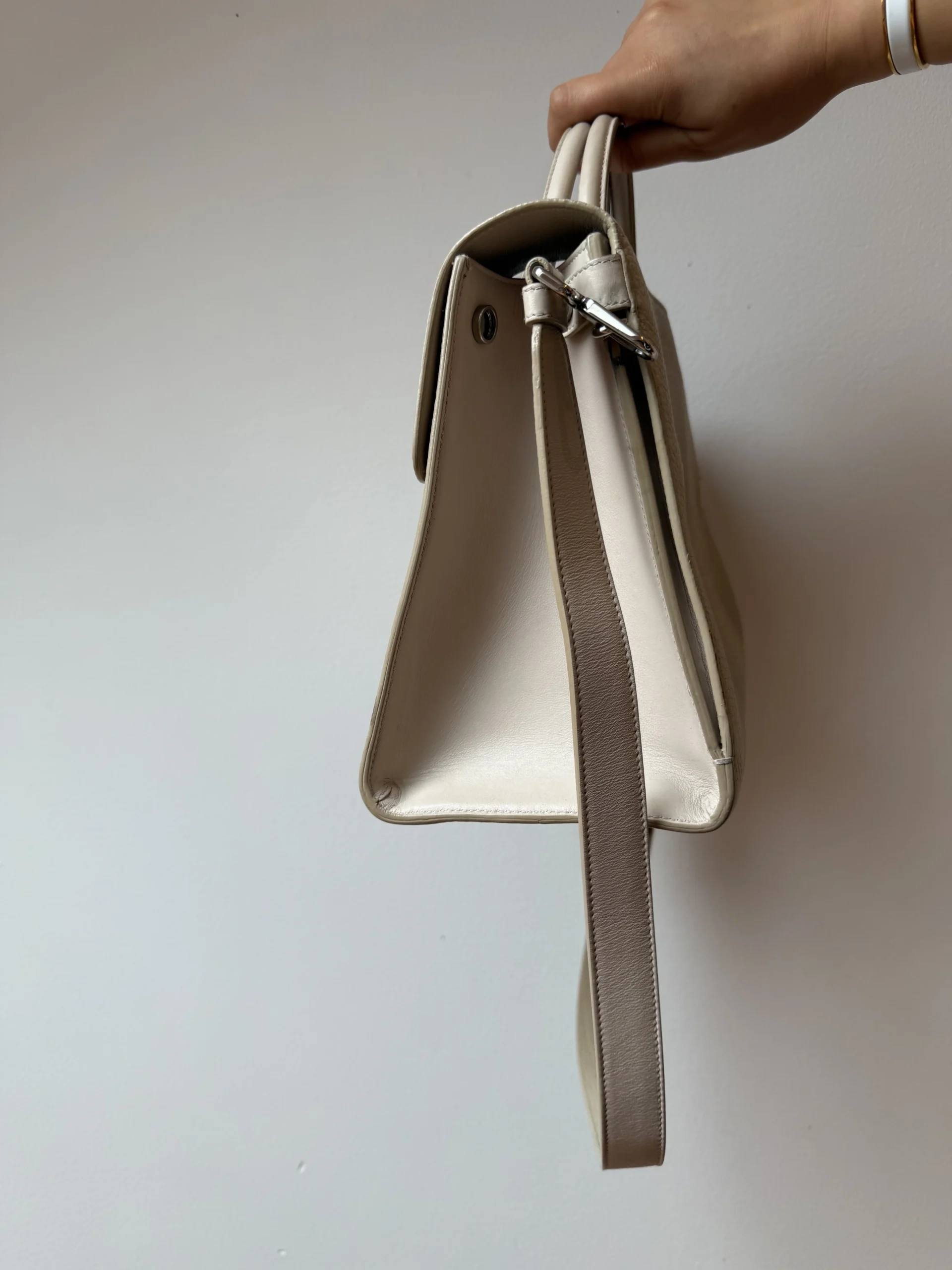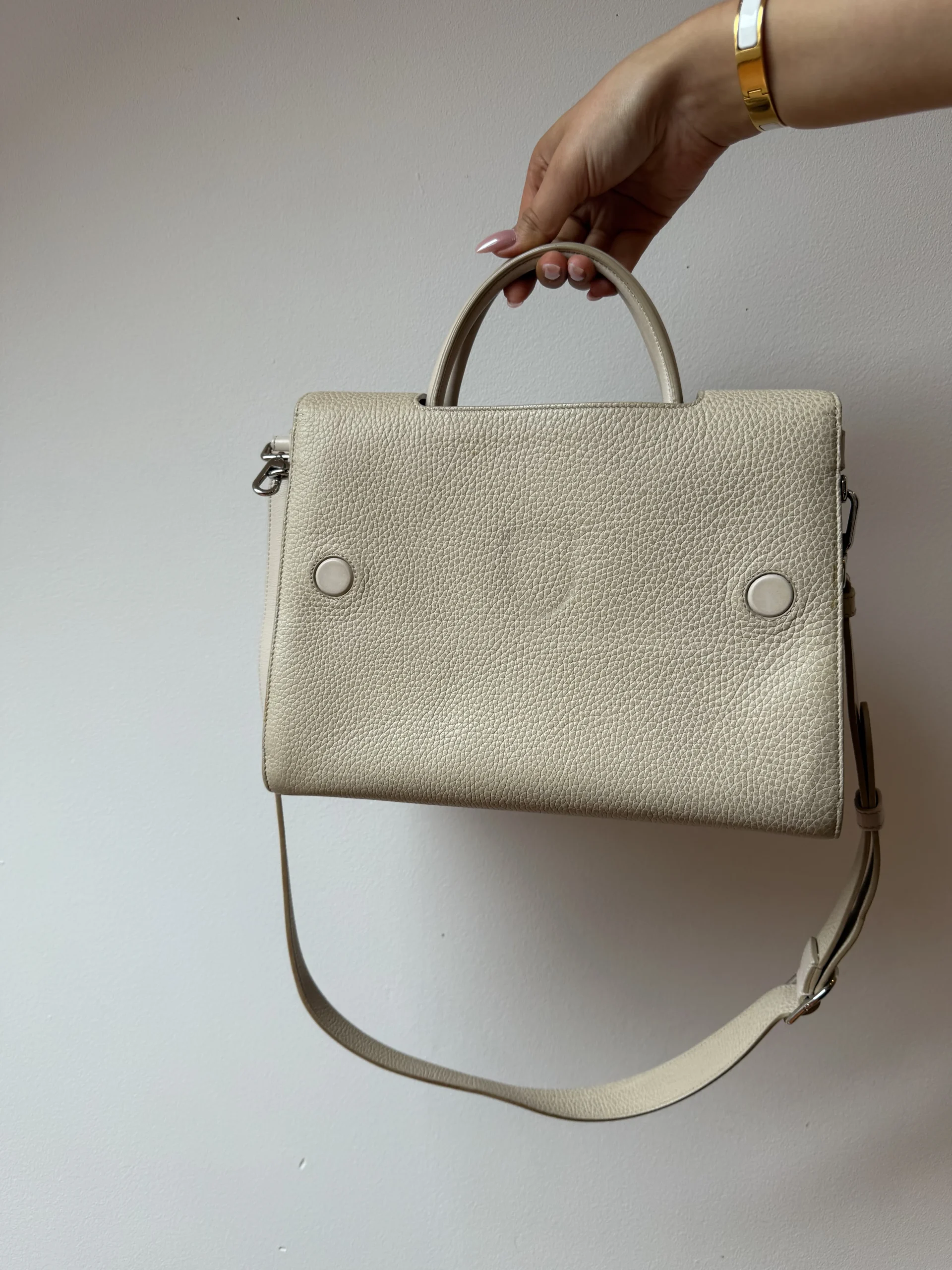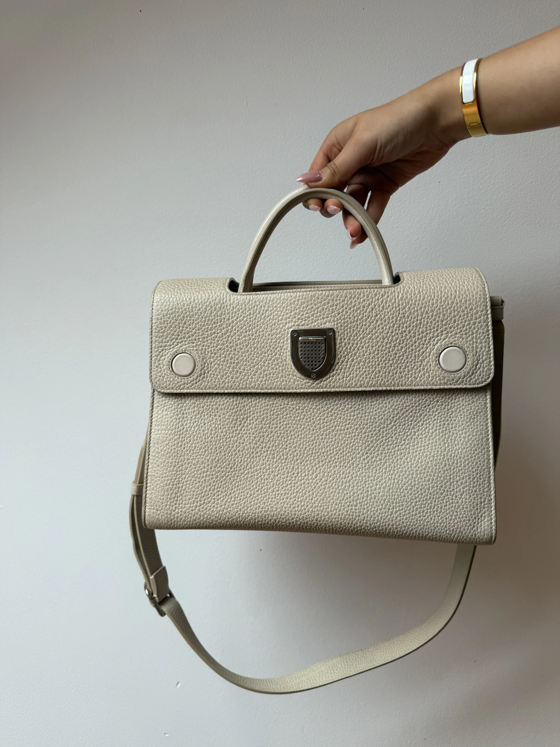 Dior Diorever Blush to elegancka, ponadczasowa torebka o wyraźnie „architektonicznej” formie, która świetnie trzyma kształt i wygląda bardzo luksusowo. Wykonana z ziarnistej skóry w delikatnym, jasnym odcieniu blush (pudrowy beż), pasuje zarówno do stylizacji dziennych, jak i bardziej formalnych.