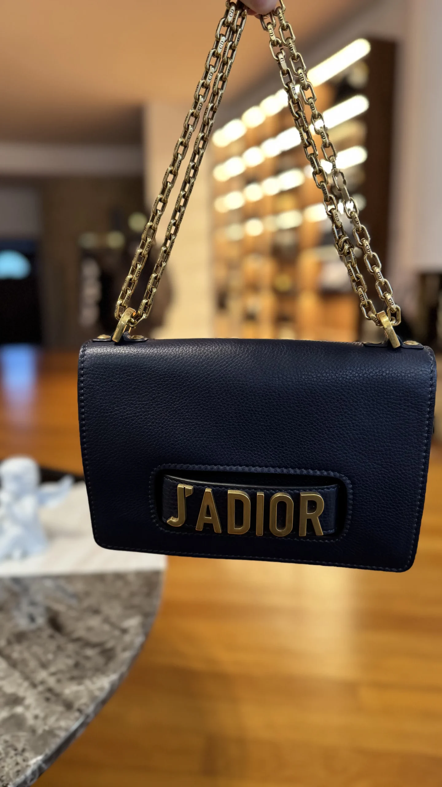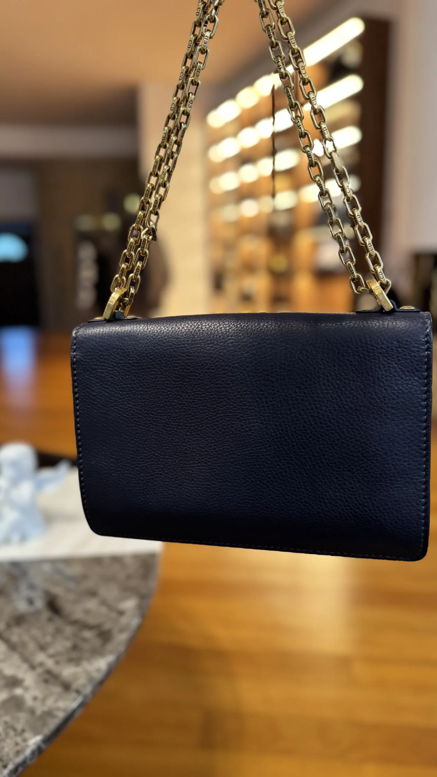Torebka Dior J’Adior to model, który zdefiniował nową erę w historii marki pod sterami Marii Grazii Chiuri. Prezentowany egzemplarz to wersja Flap Bag w eleganckim, ciemnym odcieniu granatu (Navy Blue), wykonana z trwałej, groszkowanej skóry.